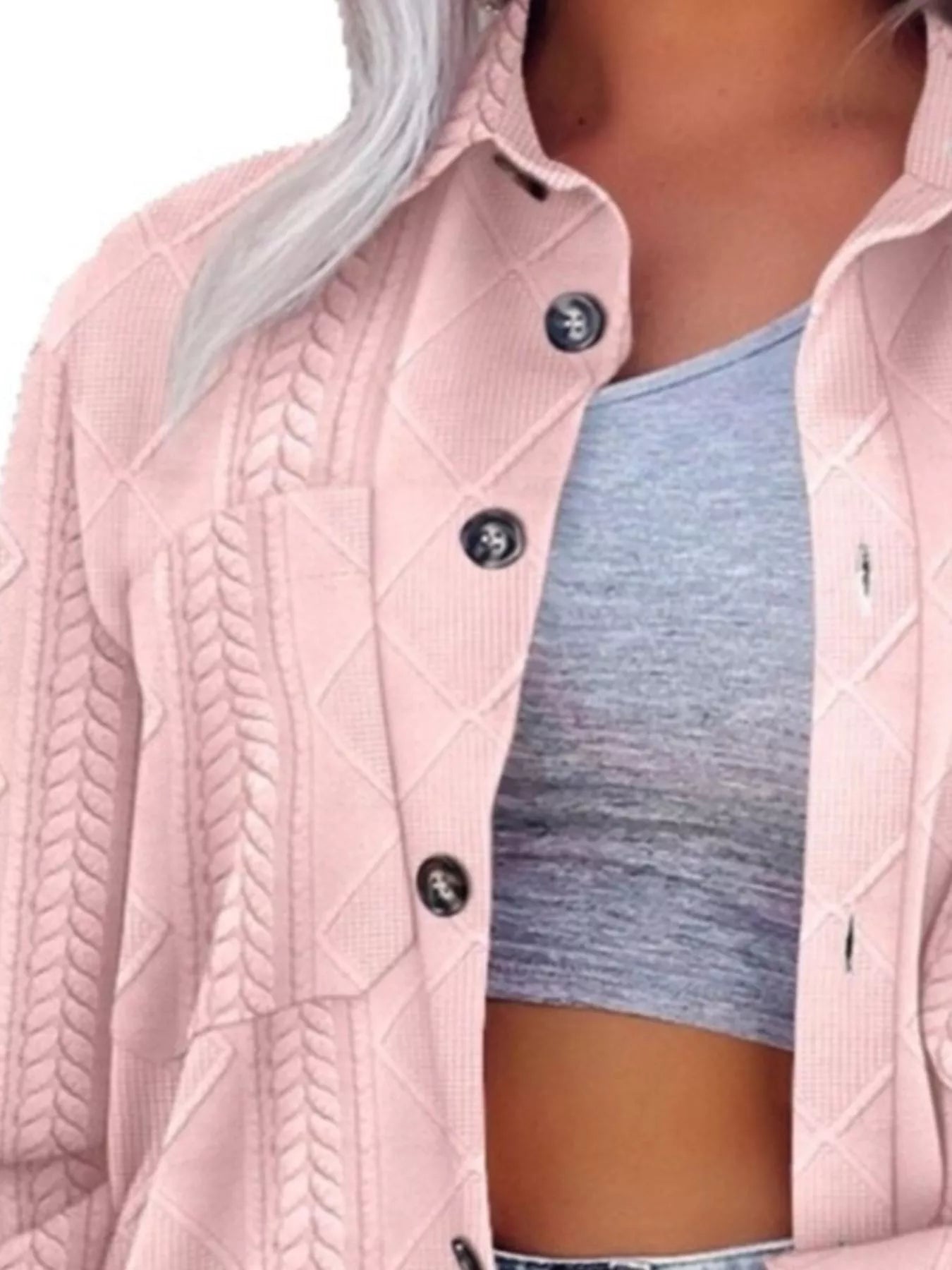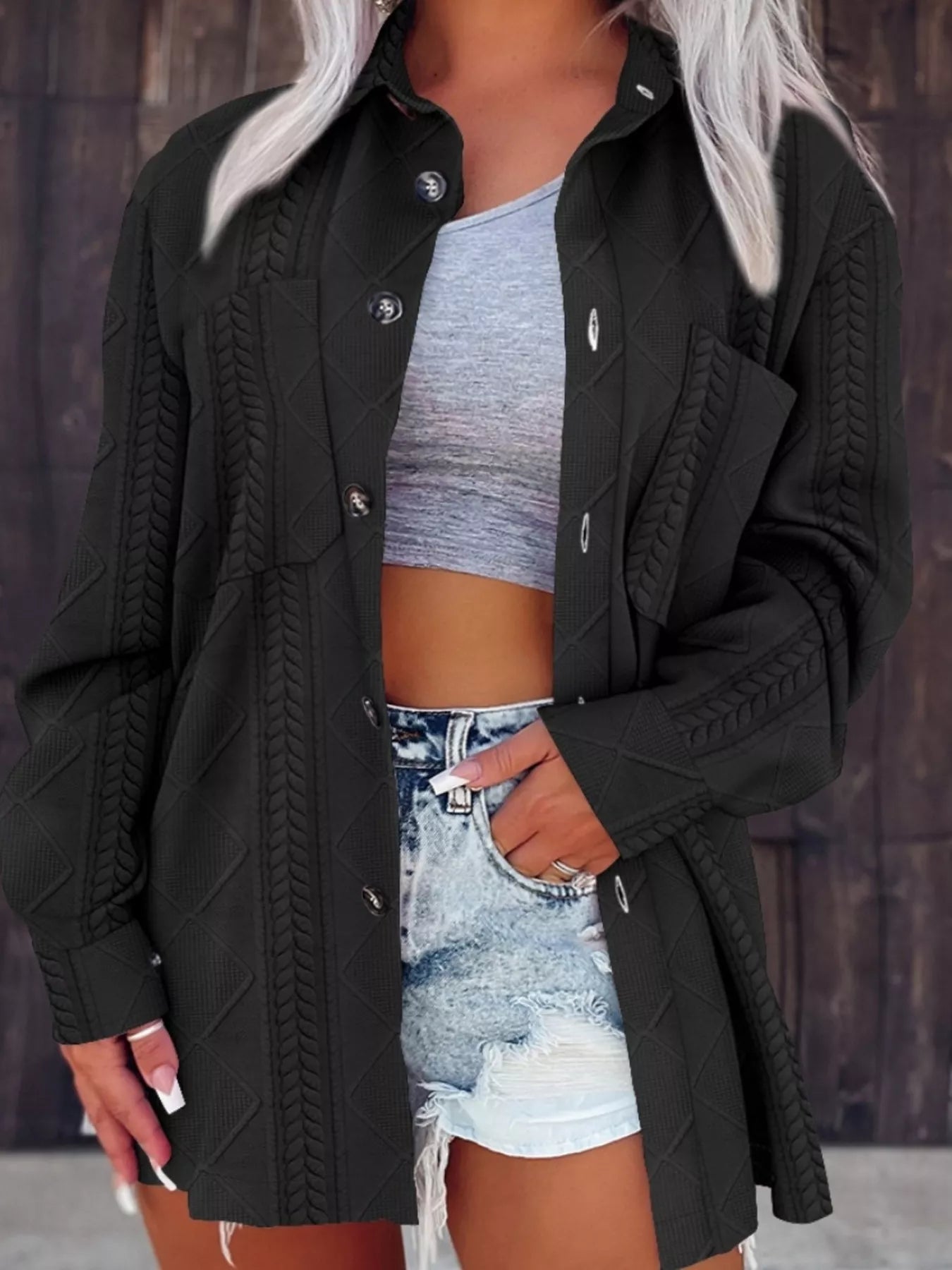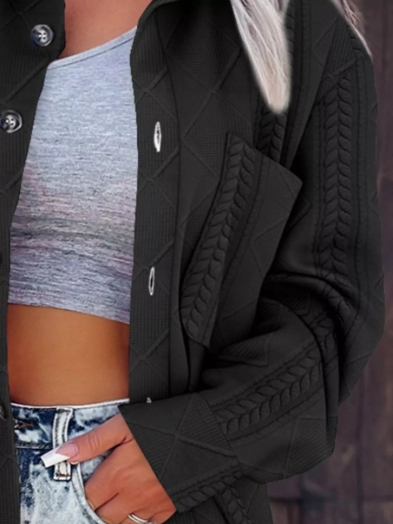 - Features: Cable-knit texture, buttoned front, practical pockets for effortless style