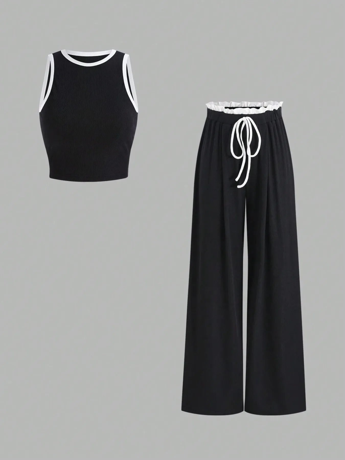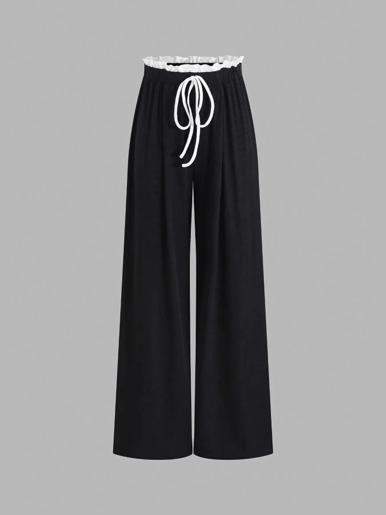 Designed to celebrate your unique silhouette, this two-piece ensemble marries style and comfort effortlessly. The drawstring feature allows you to tailor the fit around your waist, enhancing your natural curves with an elegant, fluid drape. Complemented by subtly playful frill details, the set evokes a sophisticated yet approachable charm perfect for day-to-evening wear.