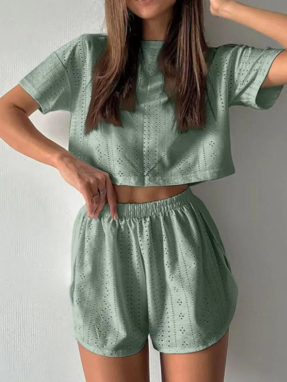 Discover an effortlessly elegant two-piece ensemble, where sophisticated design meets everyday comfort. The delicate eyelet detail introduces a refined texture that gently enhances the fabric’s fluidity, crafting a look that celebrates your silhouette with grace and style. This set is thoughtfully designed with a slightly stretchy fabric blend of 95% polyester and 5% elastane, ensuring a subtle give that moves harmoniously with your curves without clinging, allowing you to feel poised and comfortable throughout the day.