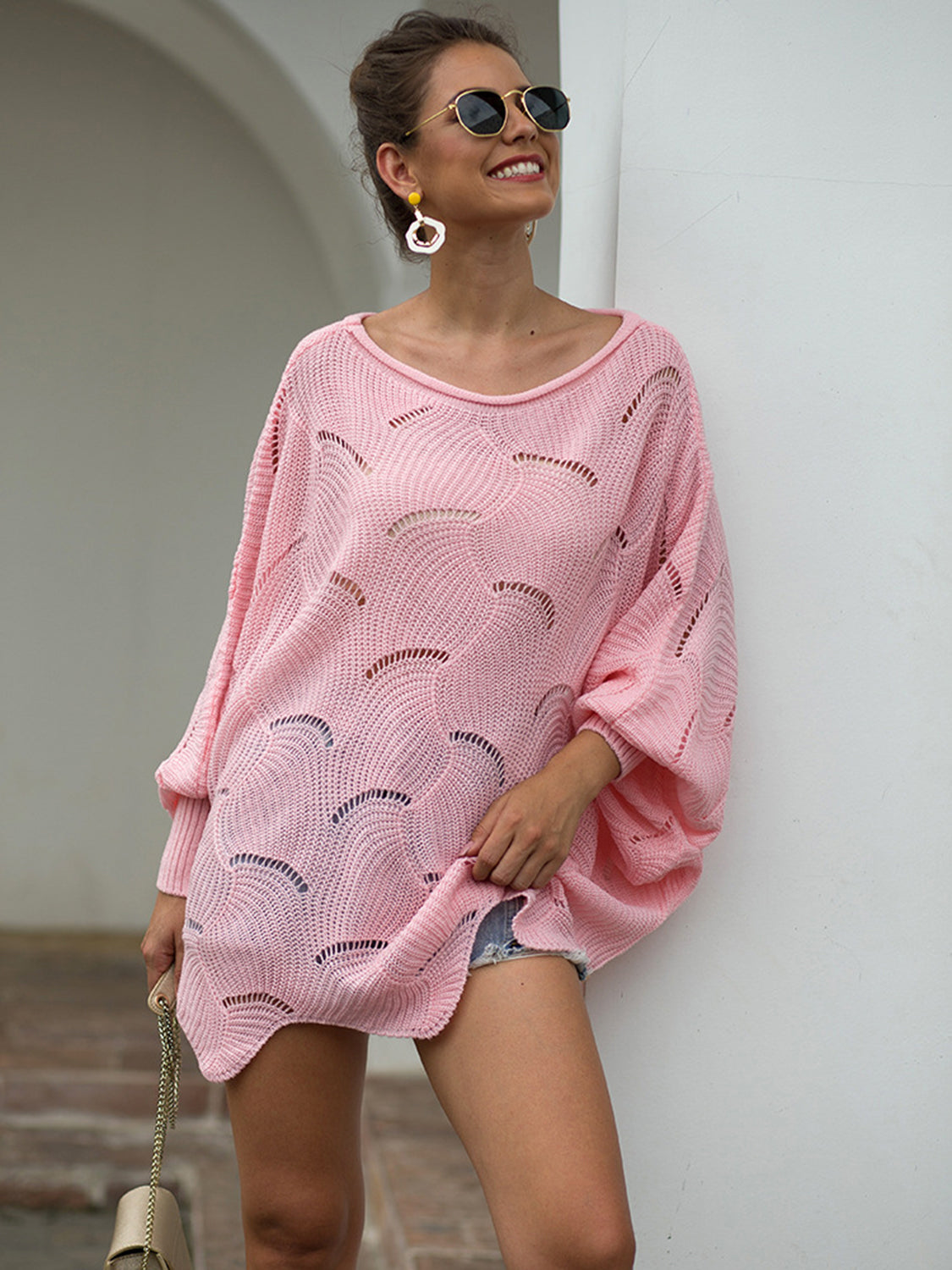 Full Size Boat Neck Lantern Sleeve Openwork Knit Top