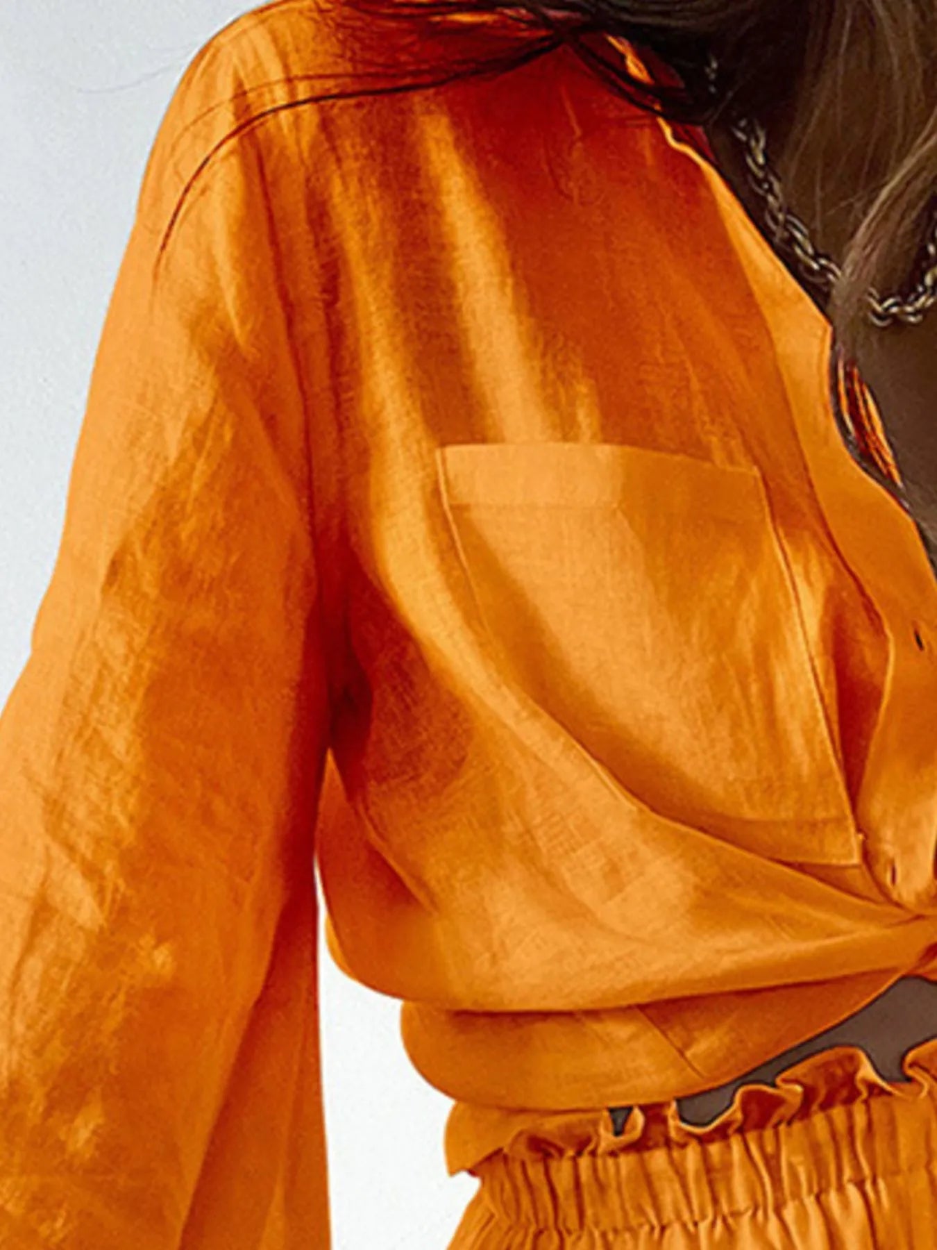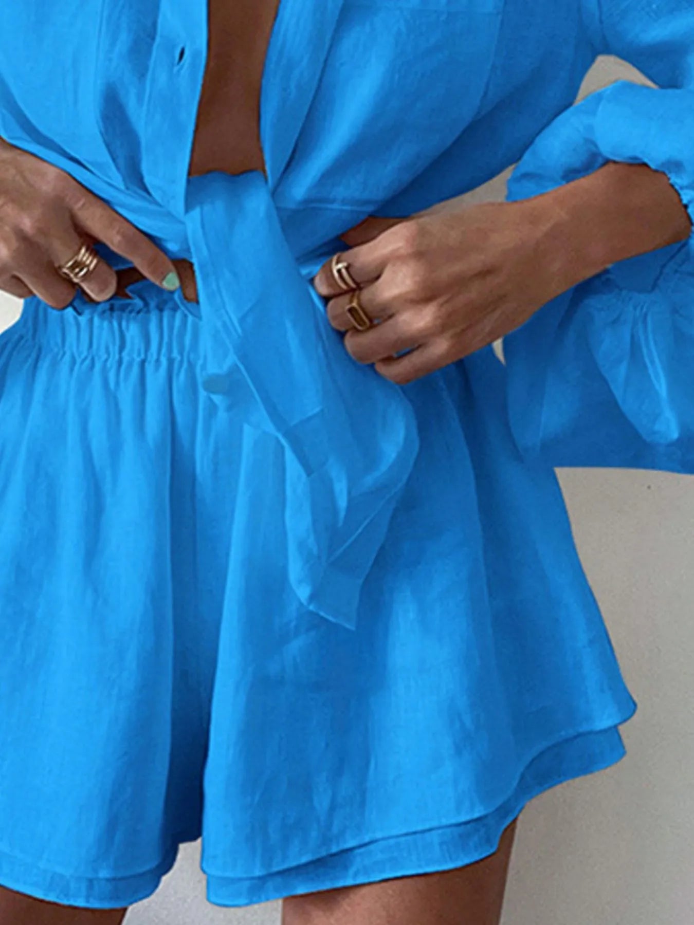 Full Size Button Up Balloon Sleeve Top and Shorts Set Plus Size