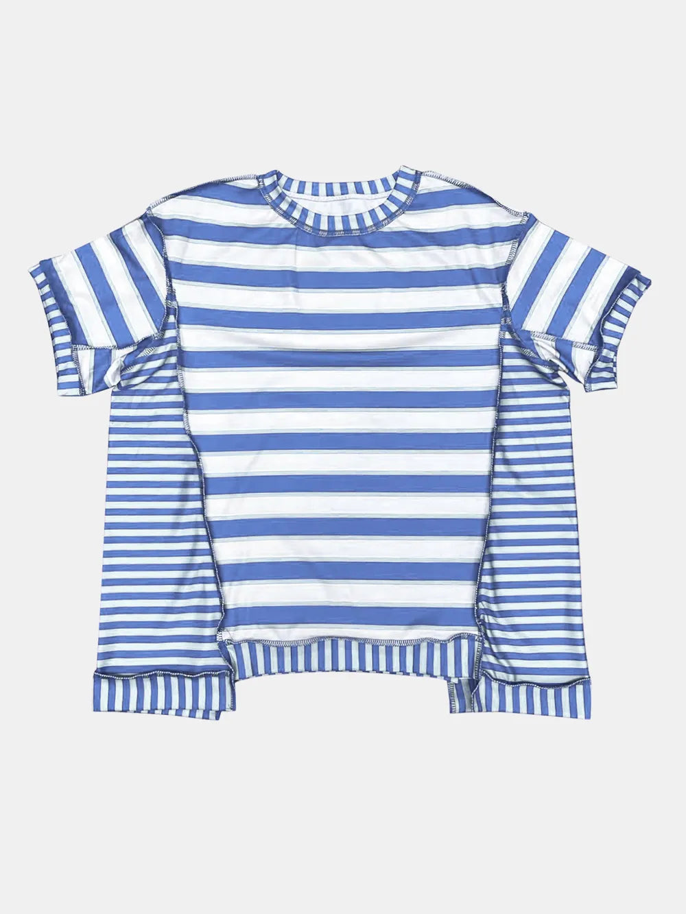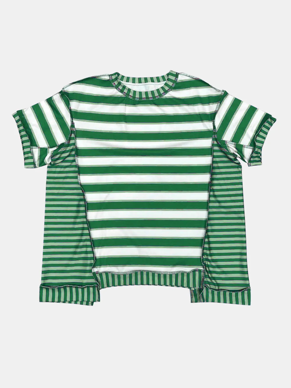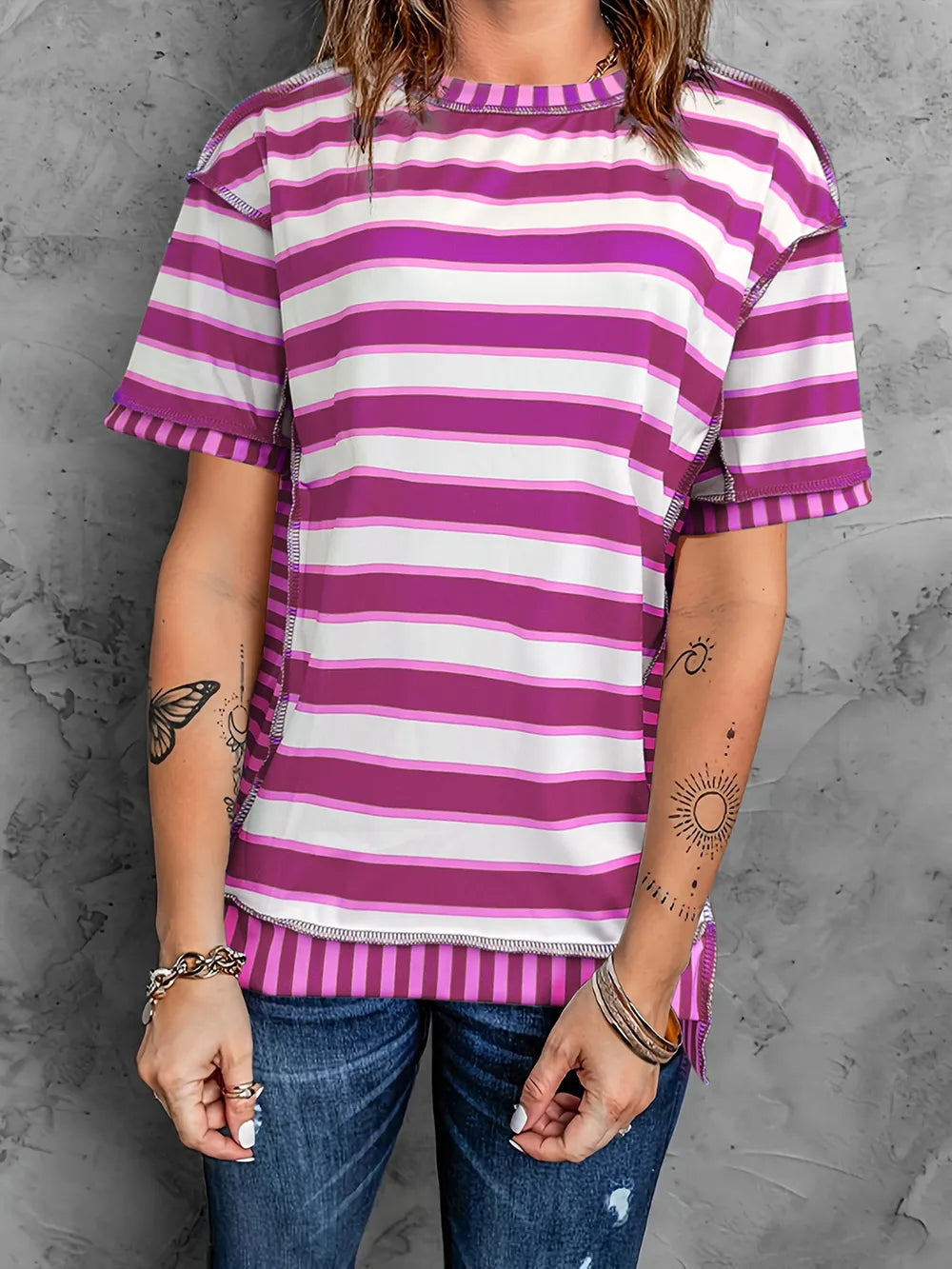 Full Size Contrast Stitching Striped Round Neck T-Shirt