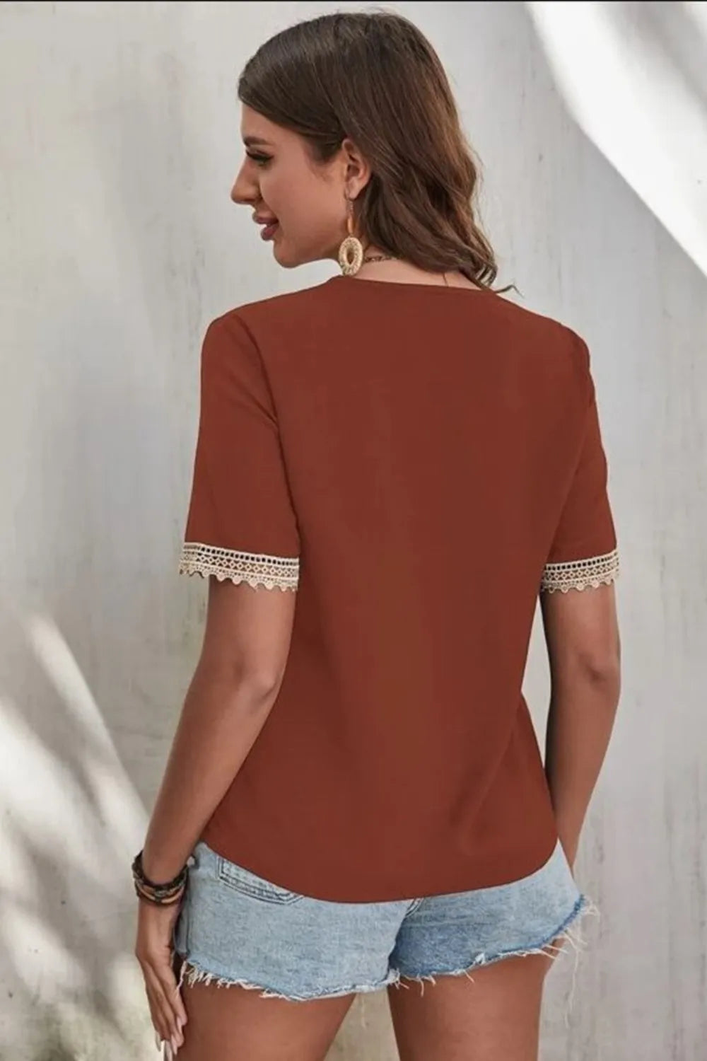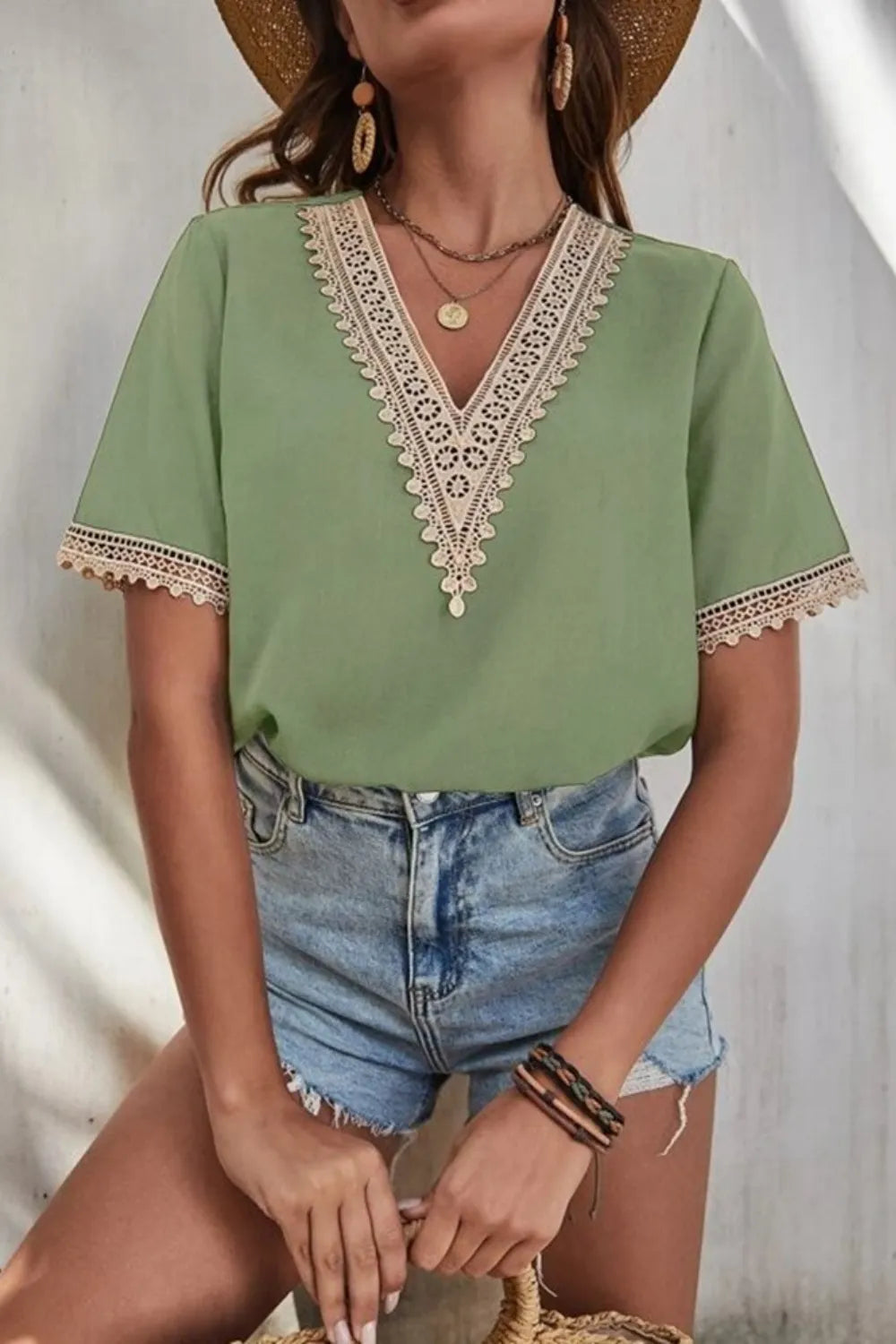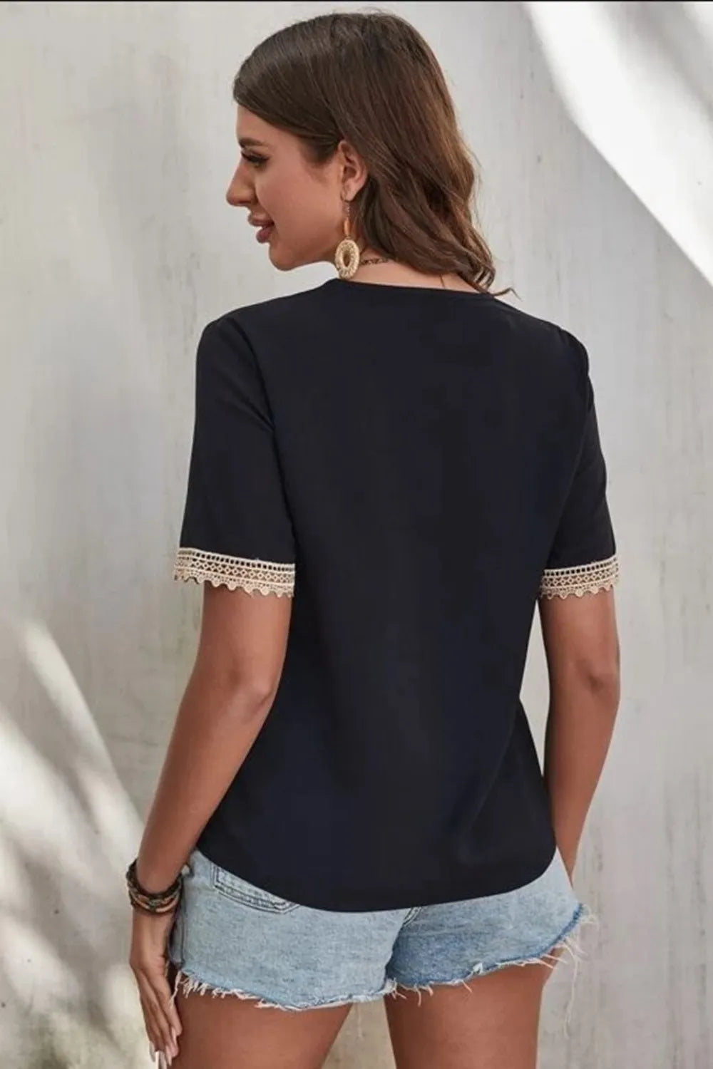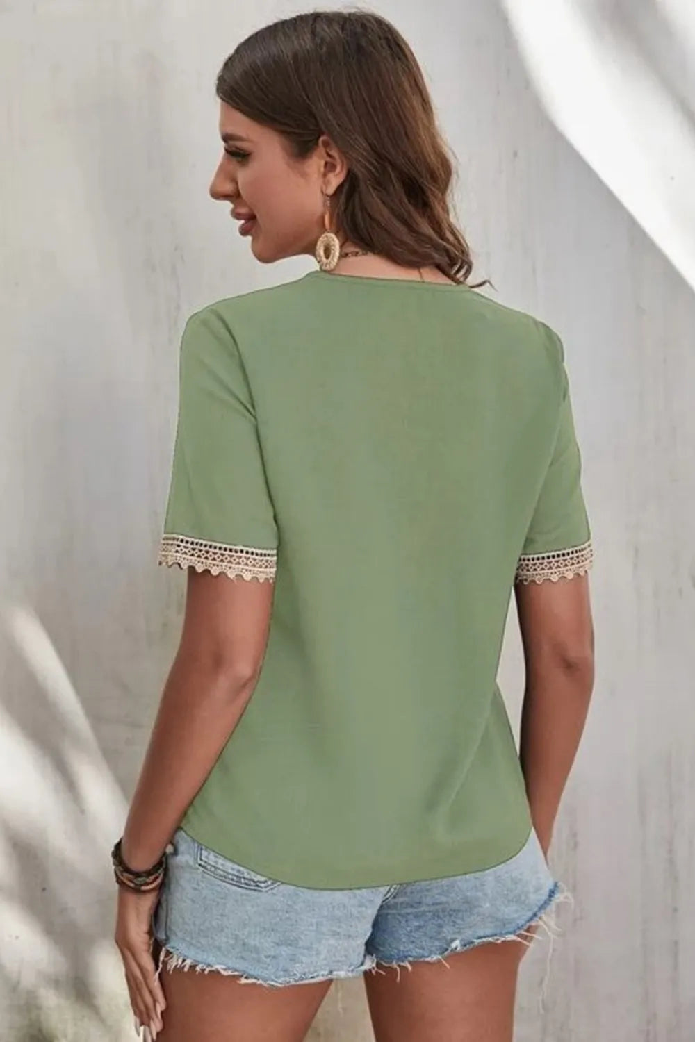 Full Size Lace Detail V-Neck Short Sleeve Blouse