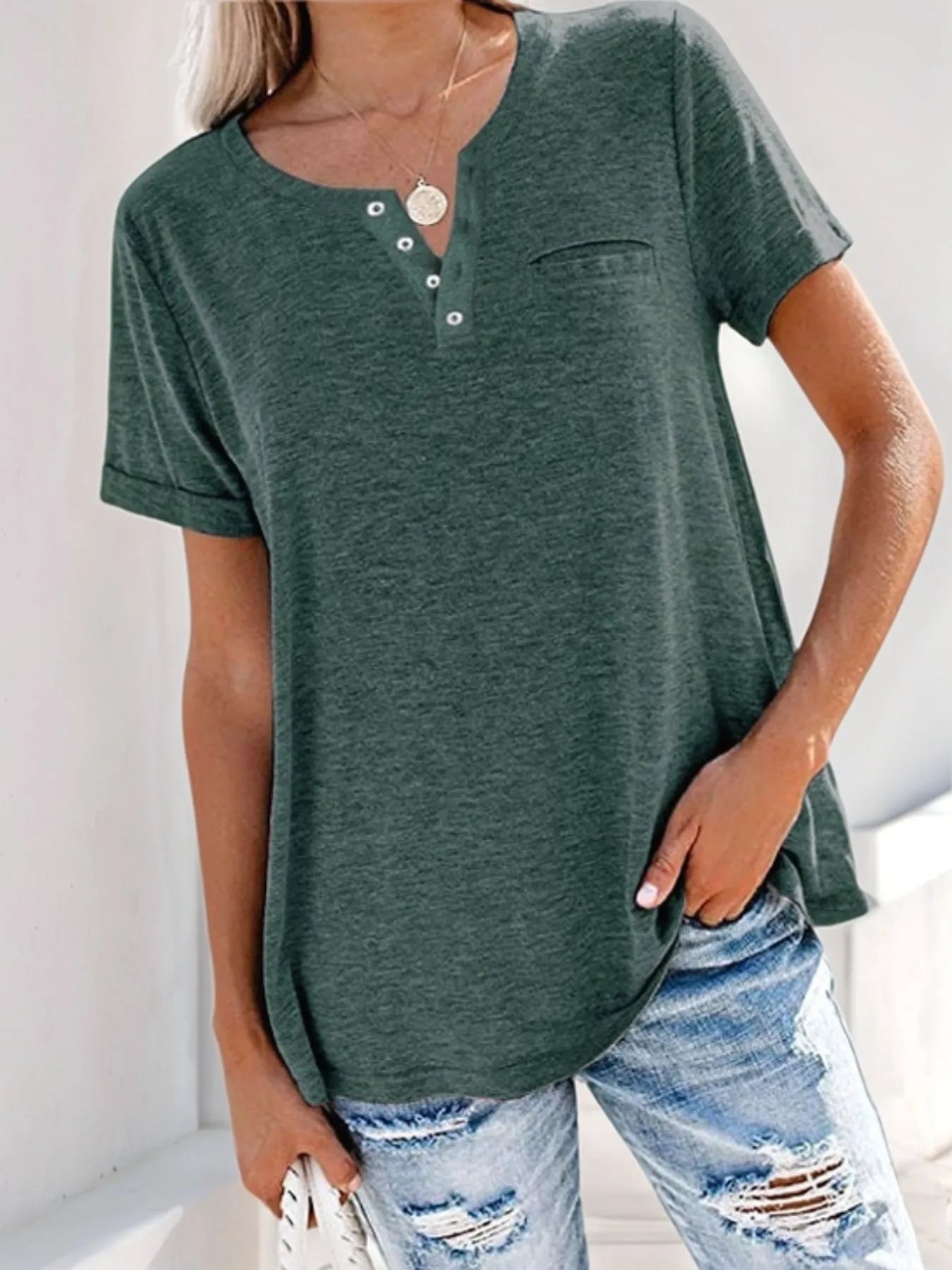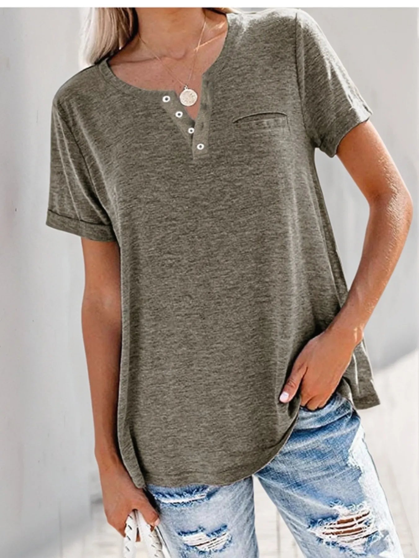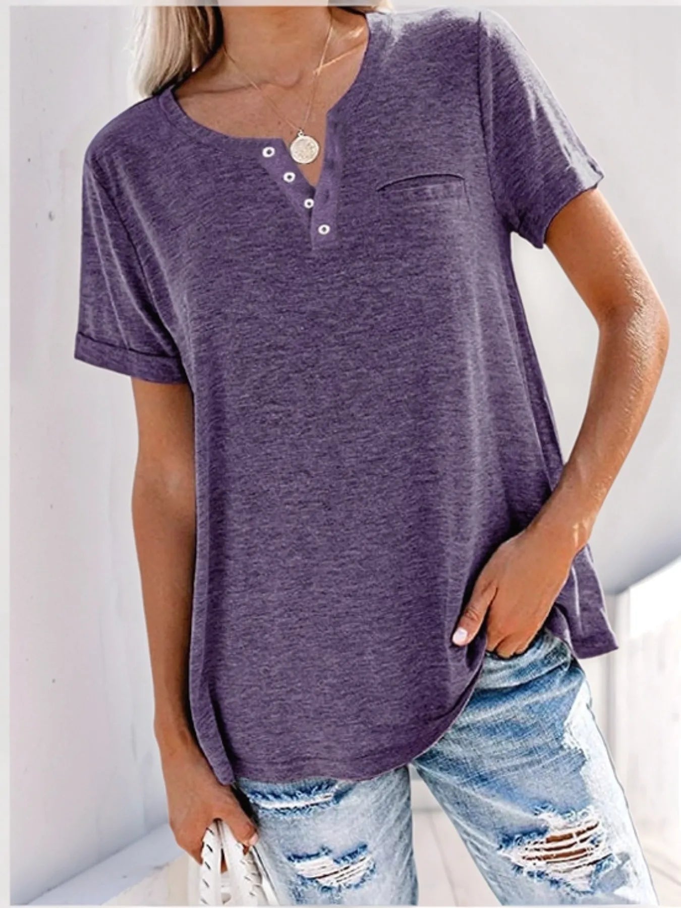 Embrace the perfect harmony of style and comfort with our Full Size Notched Short Sleeve T-Shirt from Bella plus London. This exquisite piece is thoughtfully designed to celebrate your silhouette with a classic buttoned front that adds an enduring touch of sophistication to your everyday wardrobe. The notched neckline gracefully frames your face, imparting a subtle elegance that elevates a simple tee into a refined statement.