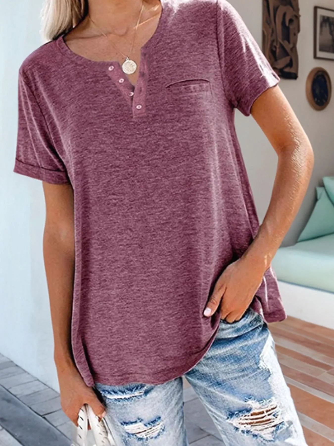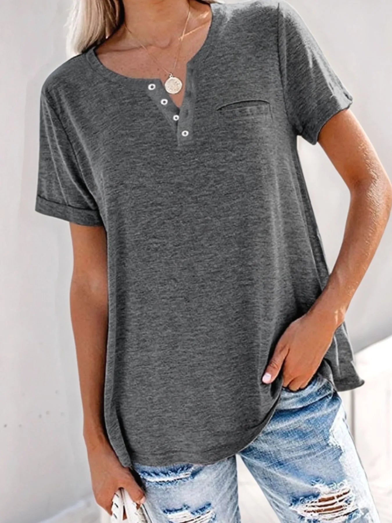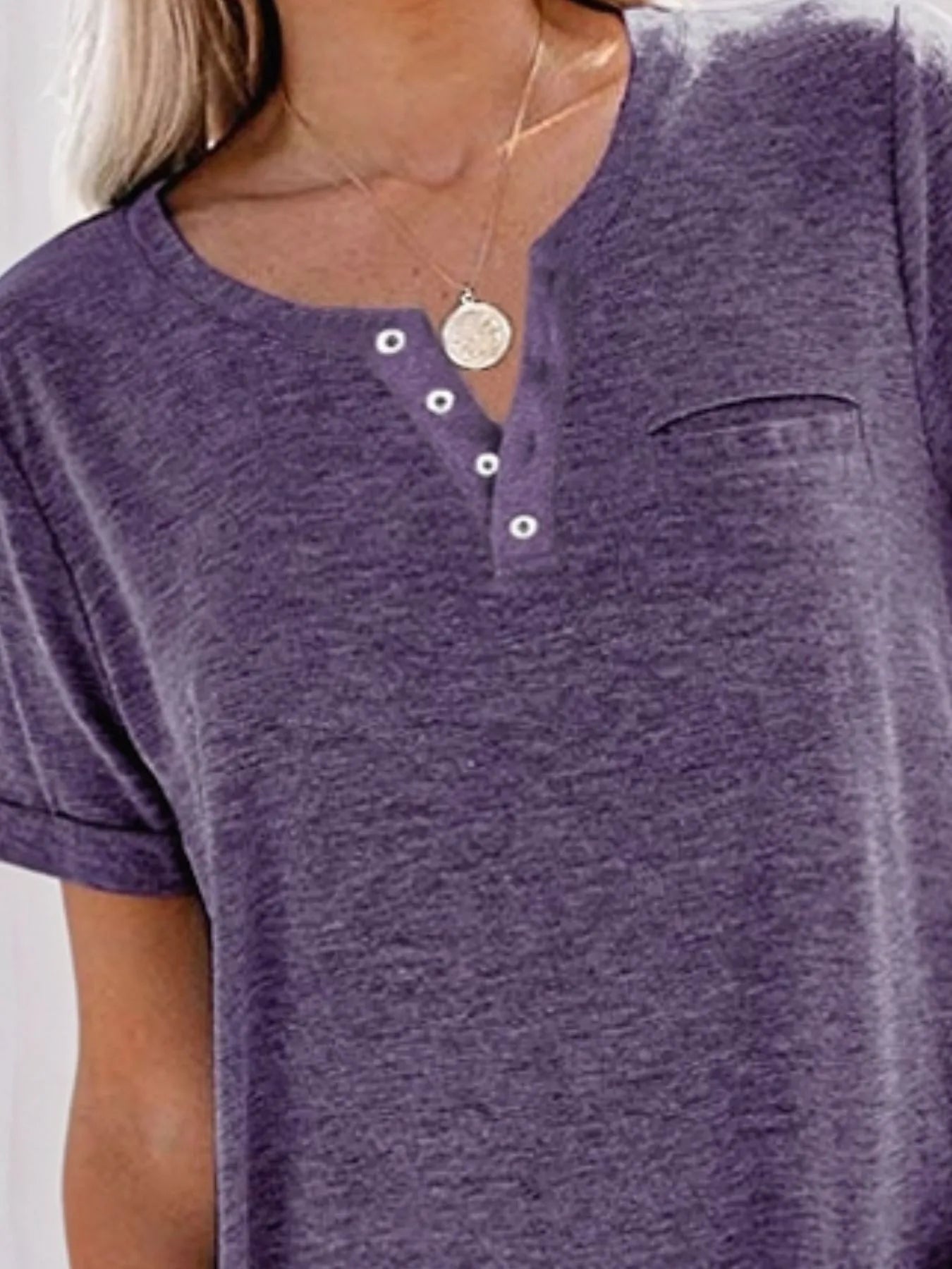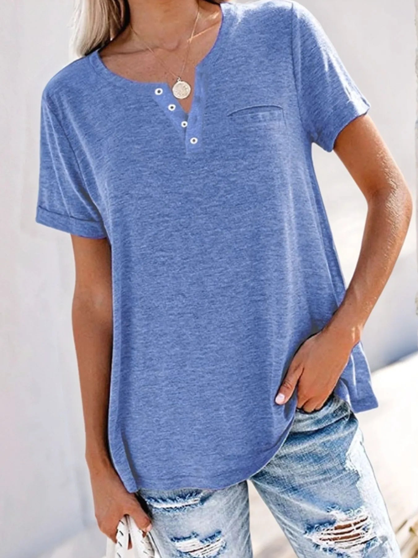 Embrace the perfect harmony of style and comfort with our Full Size Notched Short Sleeve T-Shirt from Bella plus London. This exquisite piece is thoughtfully designed to celebrate your silhouette with a classic buttoned front that adds an enduring touch of sophistication to your everyday wardrobe. The notched neckline gracefully frames your face, imparting a subtle elegance that elevates a simple tee into a refined statement.