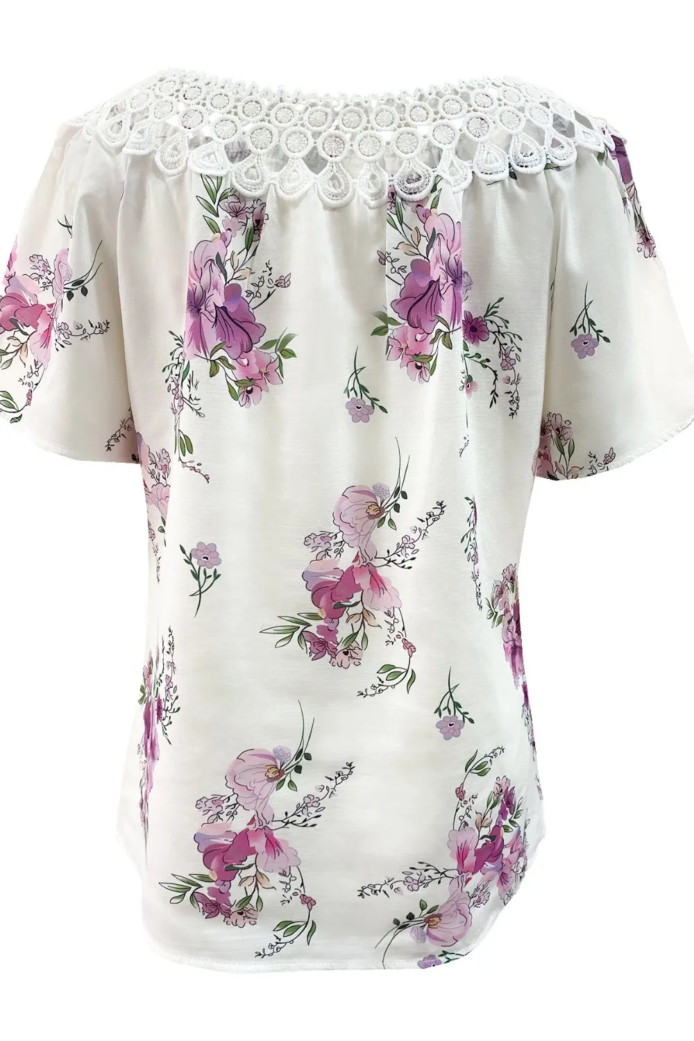 Full Size Printed Tie Neck Short Sleeve Blouse