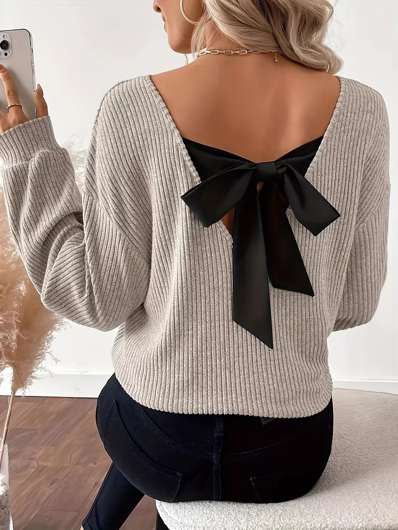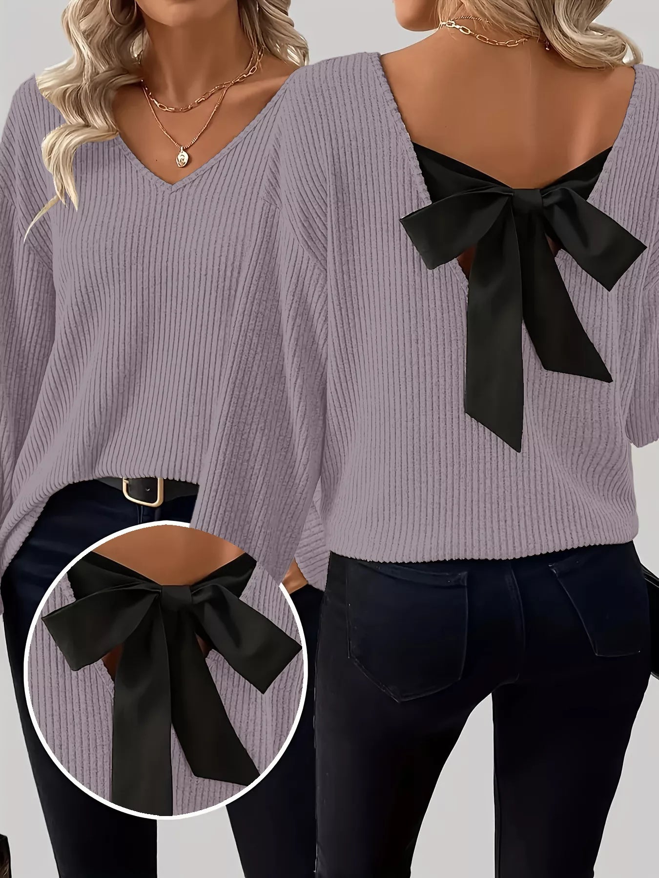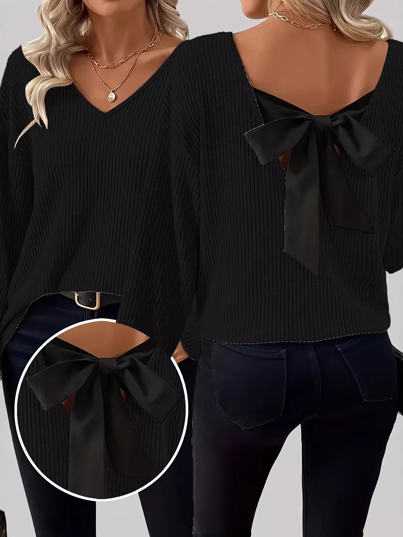 Full Size Ribbed Knit Backless Bow T-Shirt Plus Size