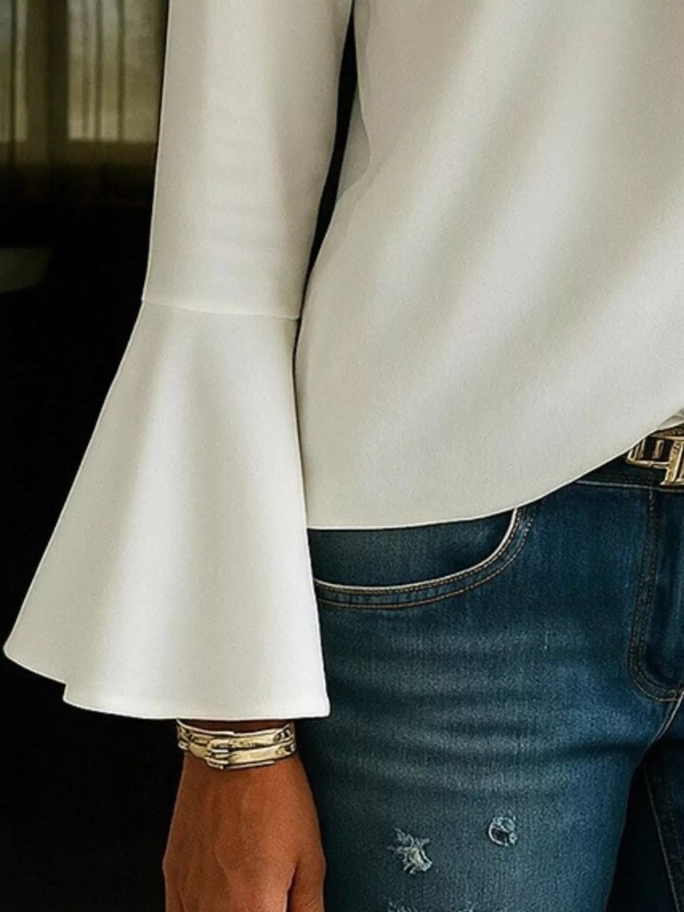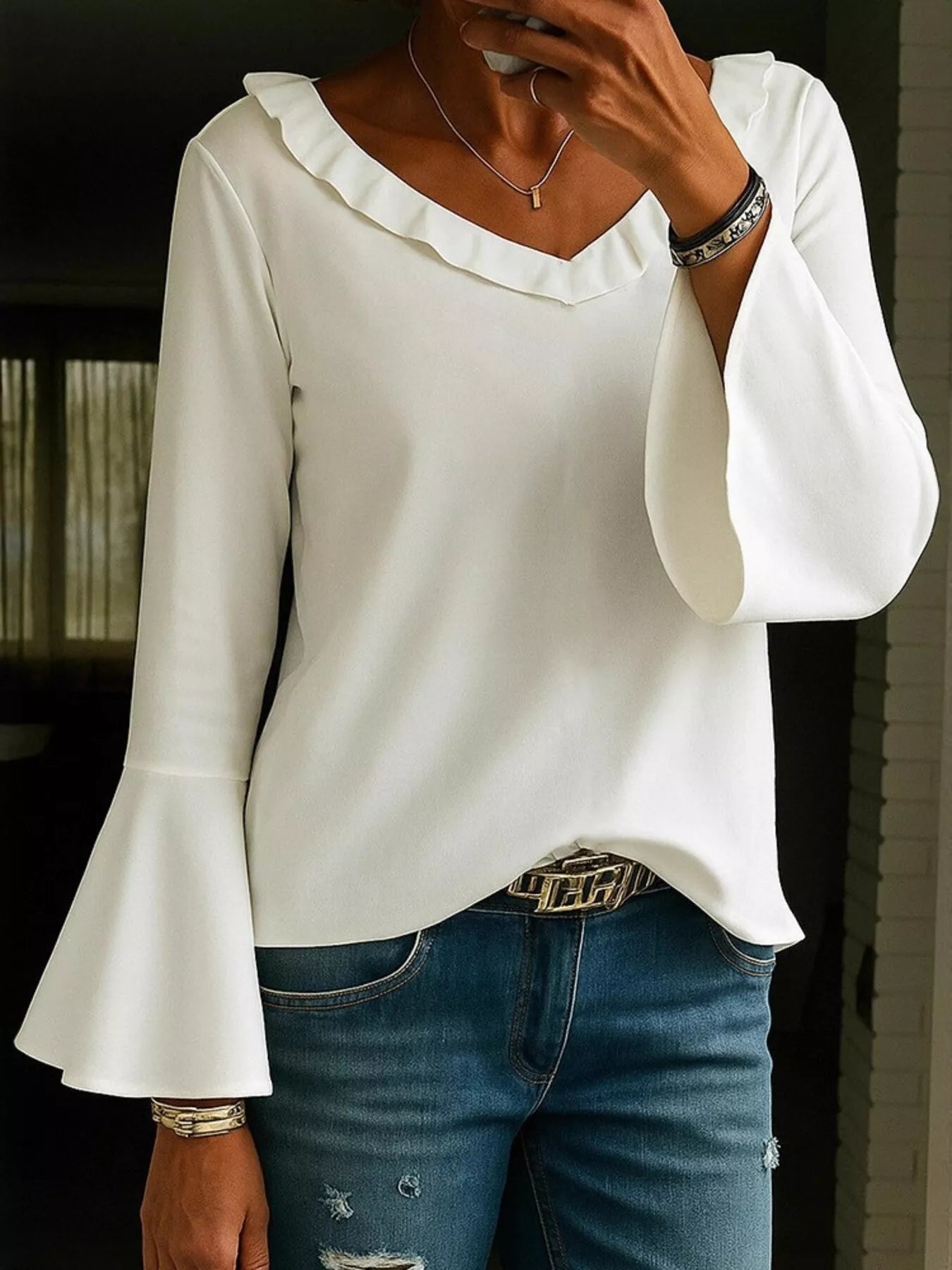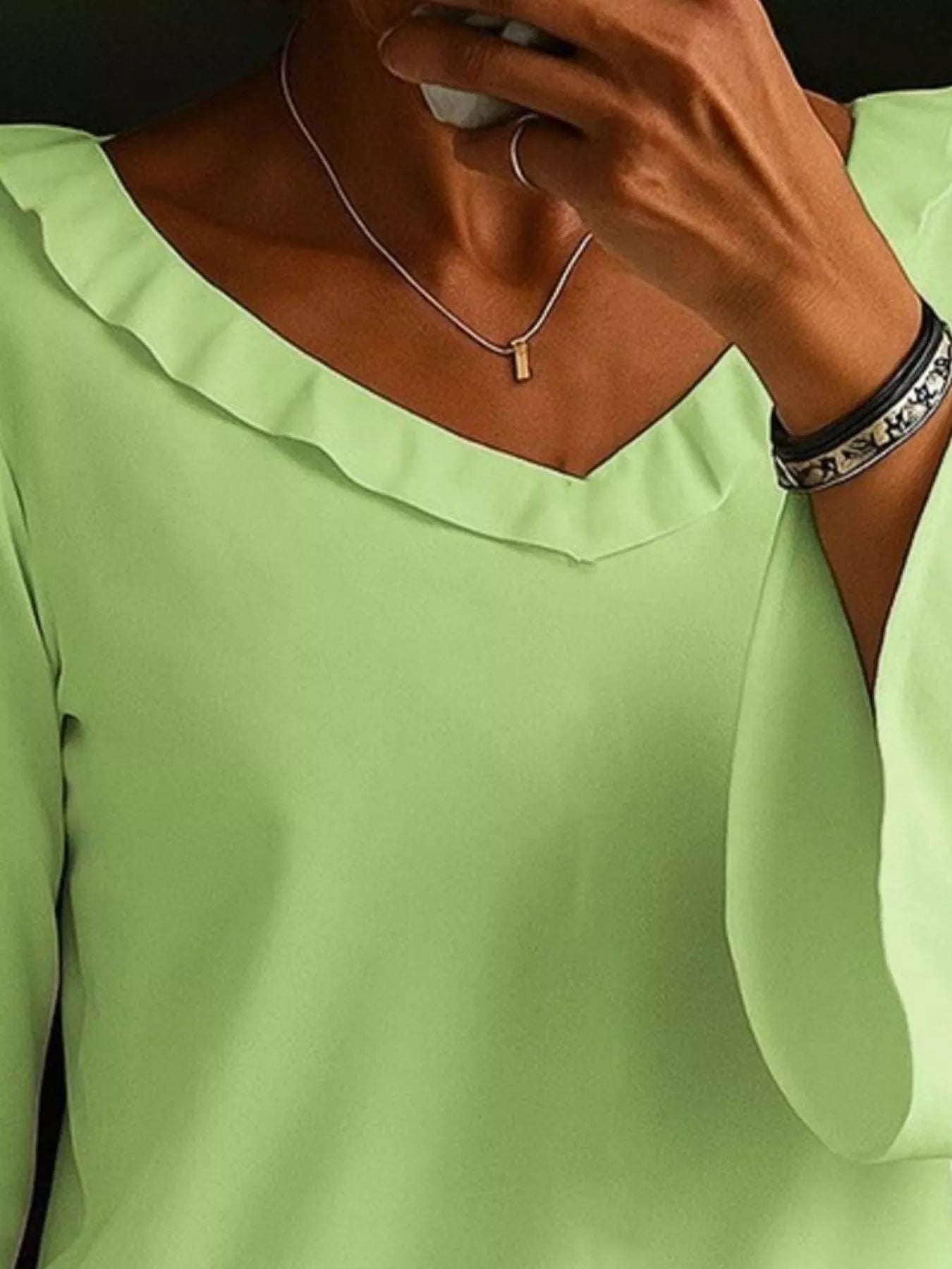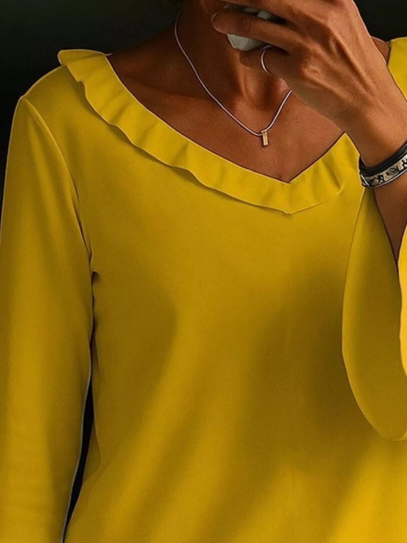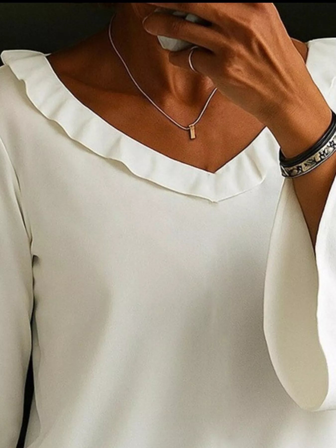 Elevate your everyday wardrobe with a blouse that marries elegance and comfort seamlessly. Experience the joy of clothing that moves with you, enhancing your silhouette with a fluid drape and sophisticated flair. Your style is an expression of your confidence—let this ruffled V-neck blouse be a part of that story.