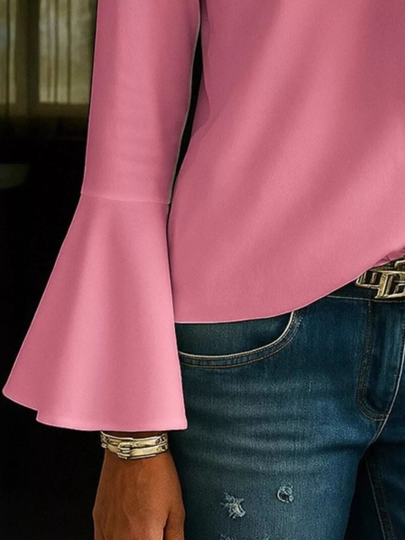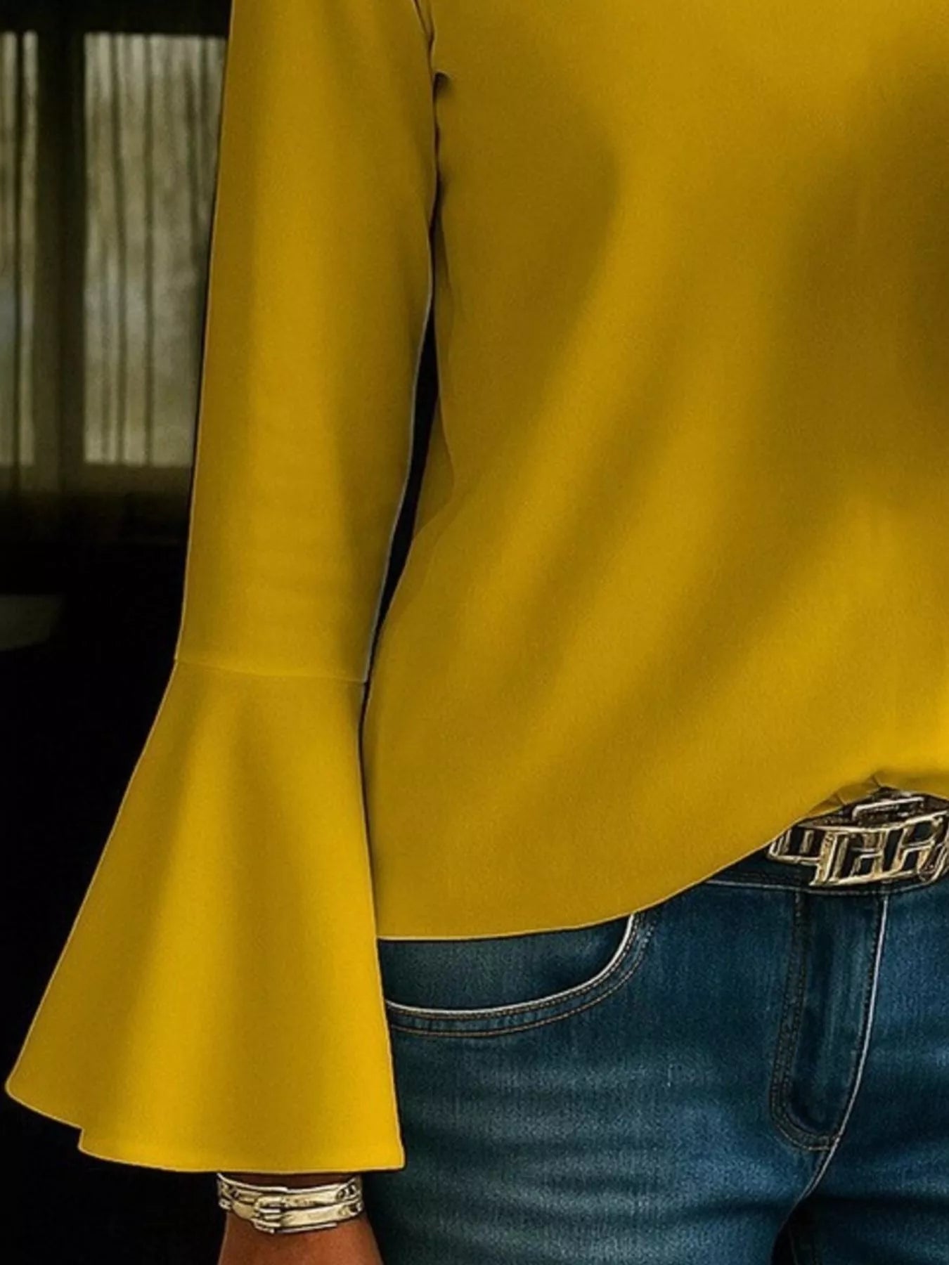 The long sleeves offer a refined touch, with an articulated design ensuring a comfortable fit through the arms, allowing freedom of movement without restriction. This thoughtful tailoring is a nod to the modern woman who values both elegance and ease, never having to choose between looking impeccable and feeling relaxed. The ruffled accents lend a subtle texture and dynamic detail that evoke an air of sophisticated charm, making this blouse a versatile staple for your wardrobe.