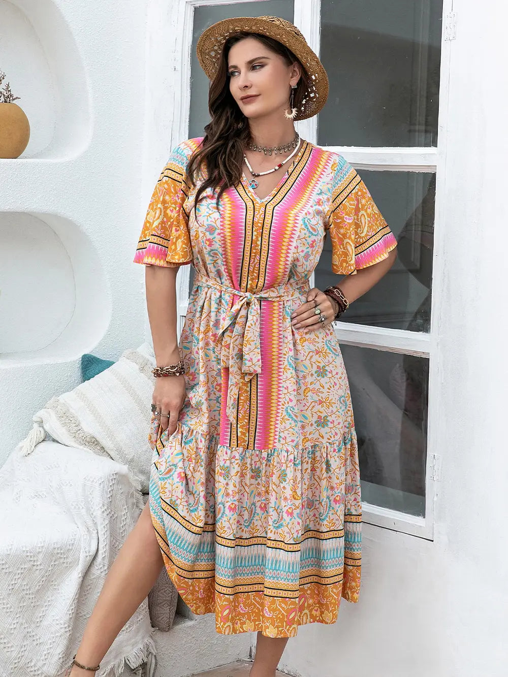 Plus Size Floral Tied Short Sleeve Midi Dress