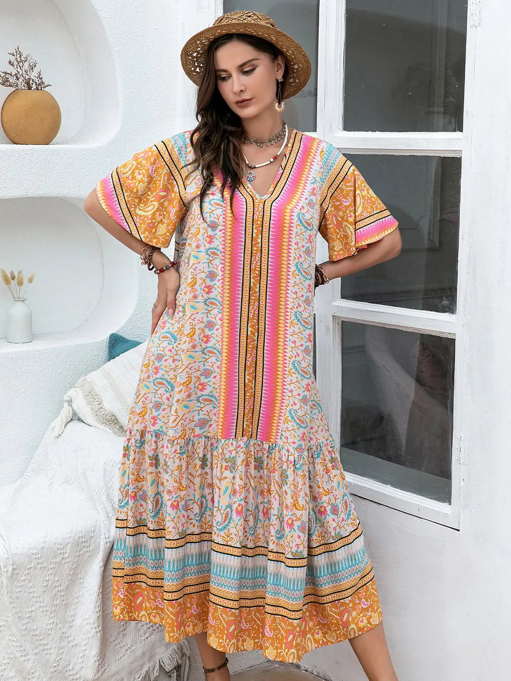 Designed for effortless style and everyday comfort, this piece offers a graceful silhouette that gently drapes your curves without restricting movement. The 100% viscose fabric provides a breathable, soft touch against the skin, ensuring you feel as good as you look. The subtle ruffled accents add a refined, feminine edge that elevates the basic design into a timeless wardrobe essential.
