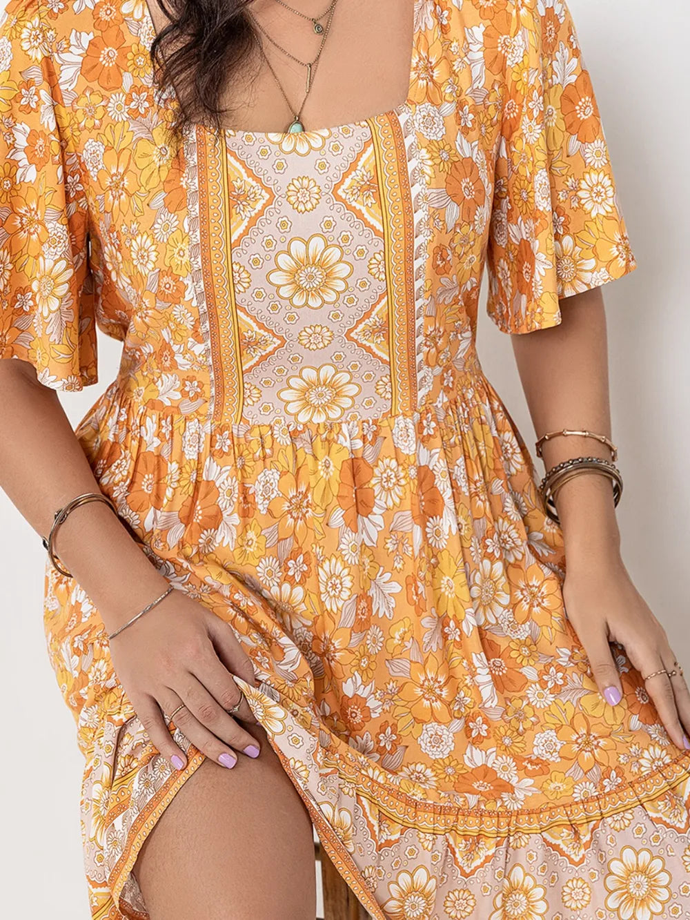 Plus Size Printed Square Neck Short Sleeve Dress