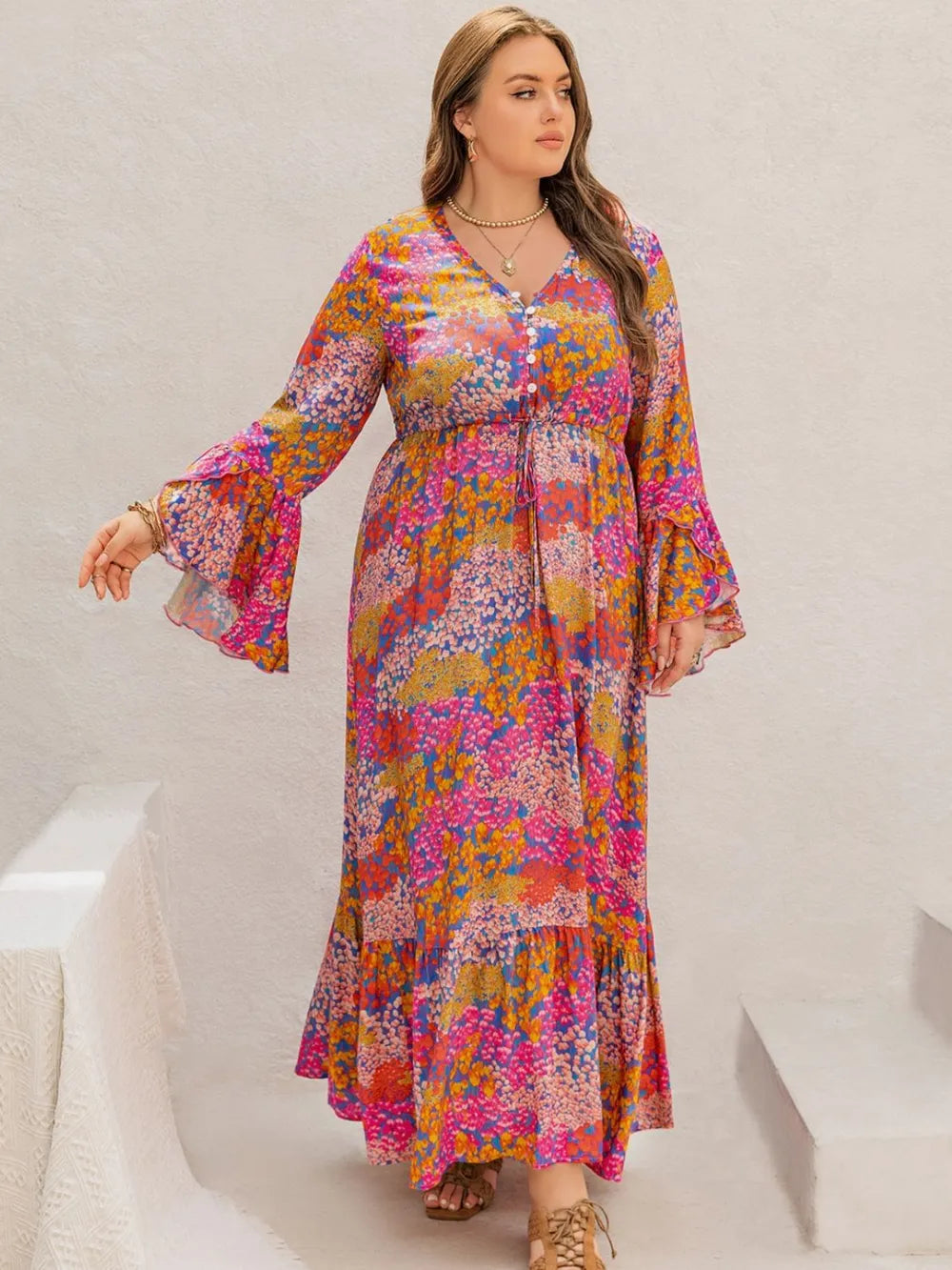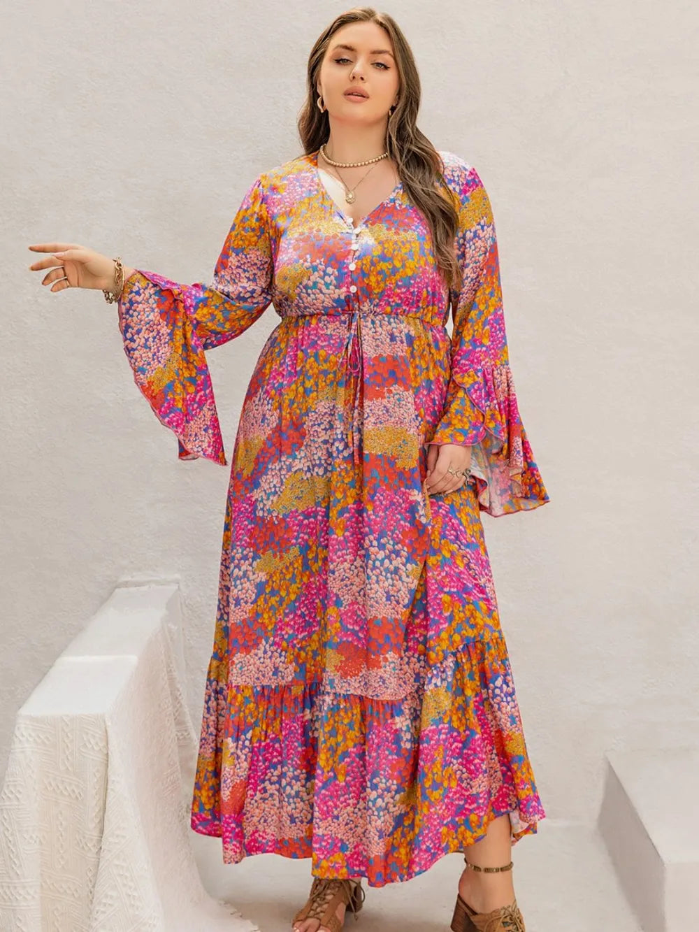 Plus Size Printed V-Neck Long Sleeve Maxi Dress