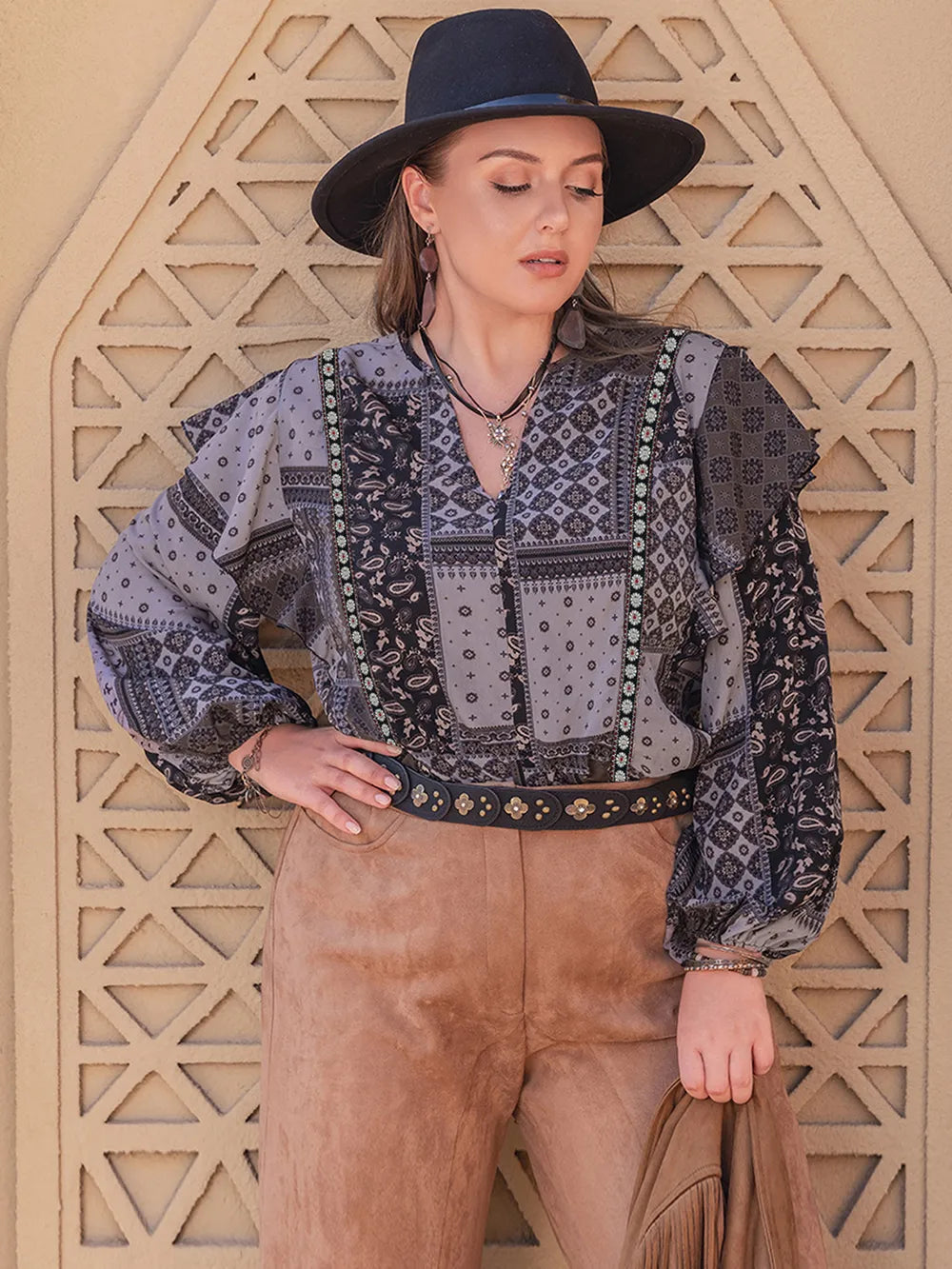 Plus Size Ruffled Printed Notched Long Sleeve Blouse