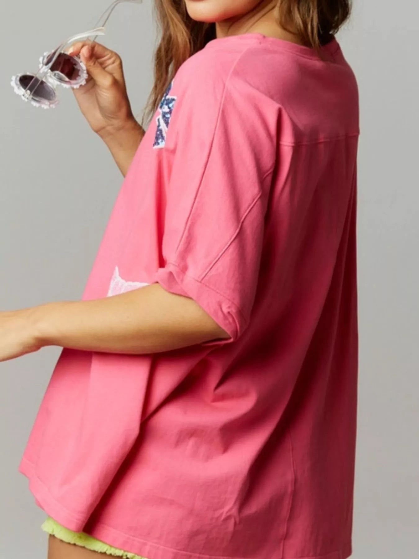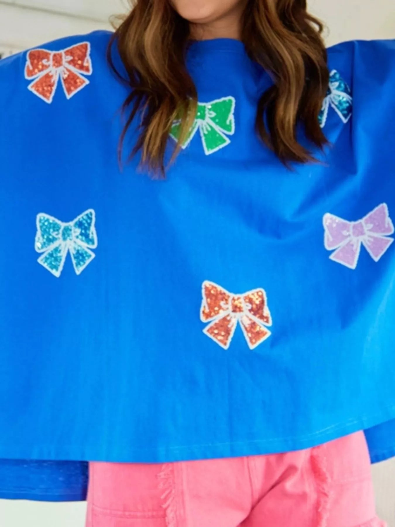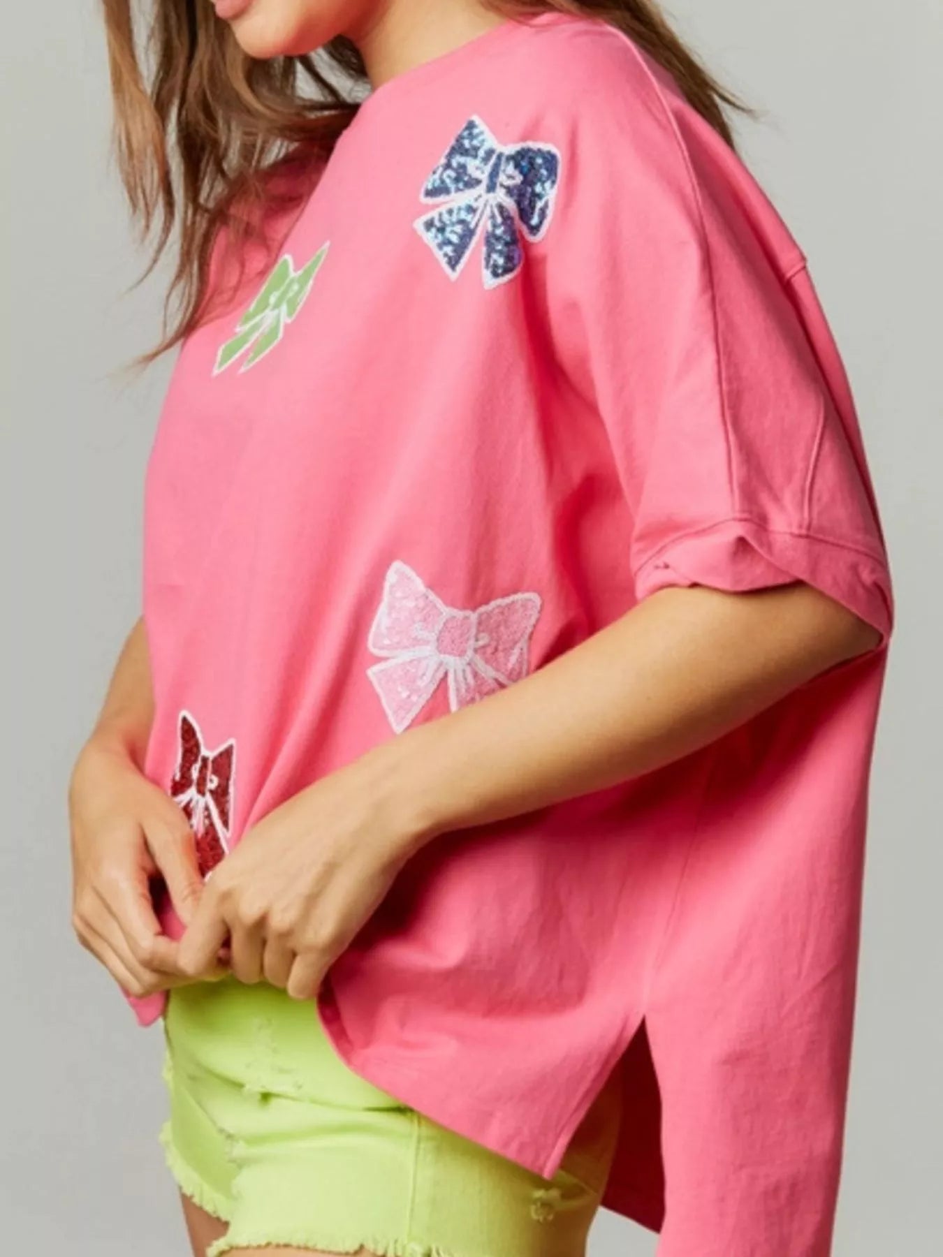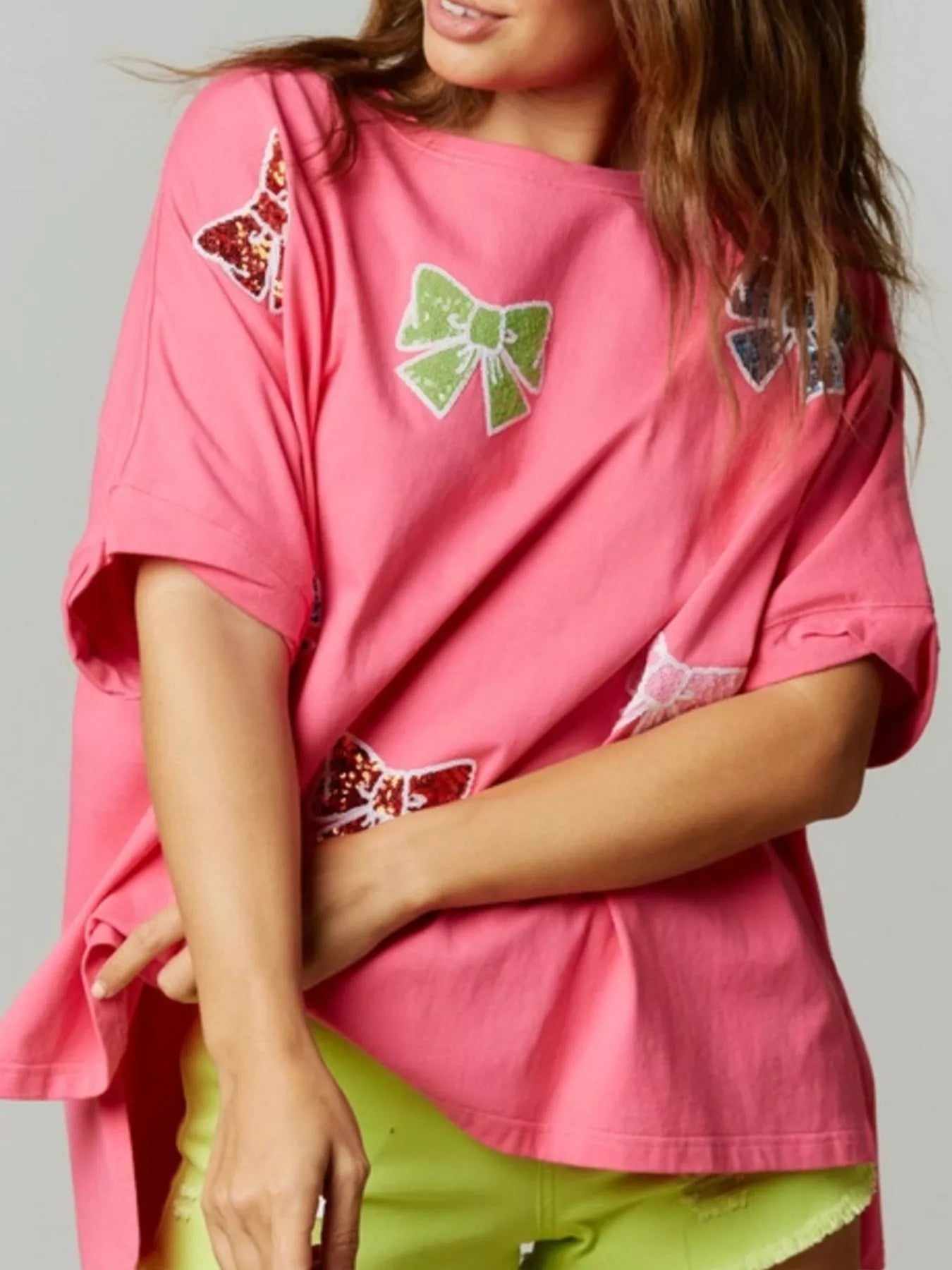 Embrace an effortlessly chic look with this oversized top, where a beautifully crafted bow applique adds a sophisticated focal point that elevates your ensemble. Designed with a slightly stretchy 100% polyester fabric, it gently drapes your curves, creating a fluid silhouette that moves with you throughout the day. The lightweight material ensures breathable comfort, while the oversized fit offers freedom without compromising on style.