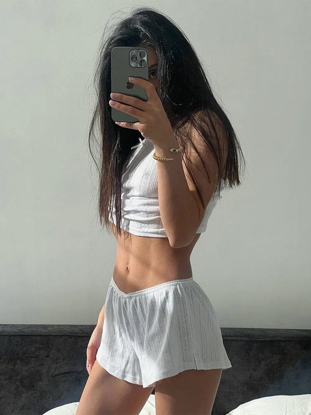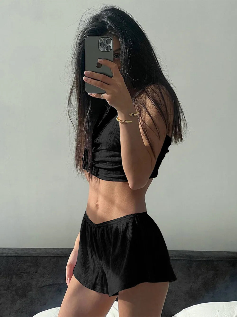 The tailored top length and bottom length have been thoughtfully measured to provide a harmonious fit, enhancing your shape while delivering the ease you crave throughout your day. Whether layered or worn alone, this set complements your wardrobe with its versatile design and modern appeal.